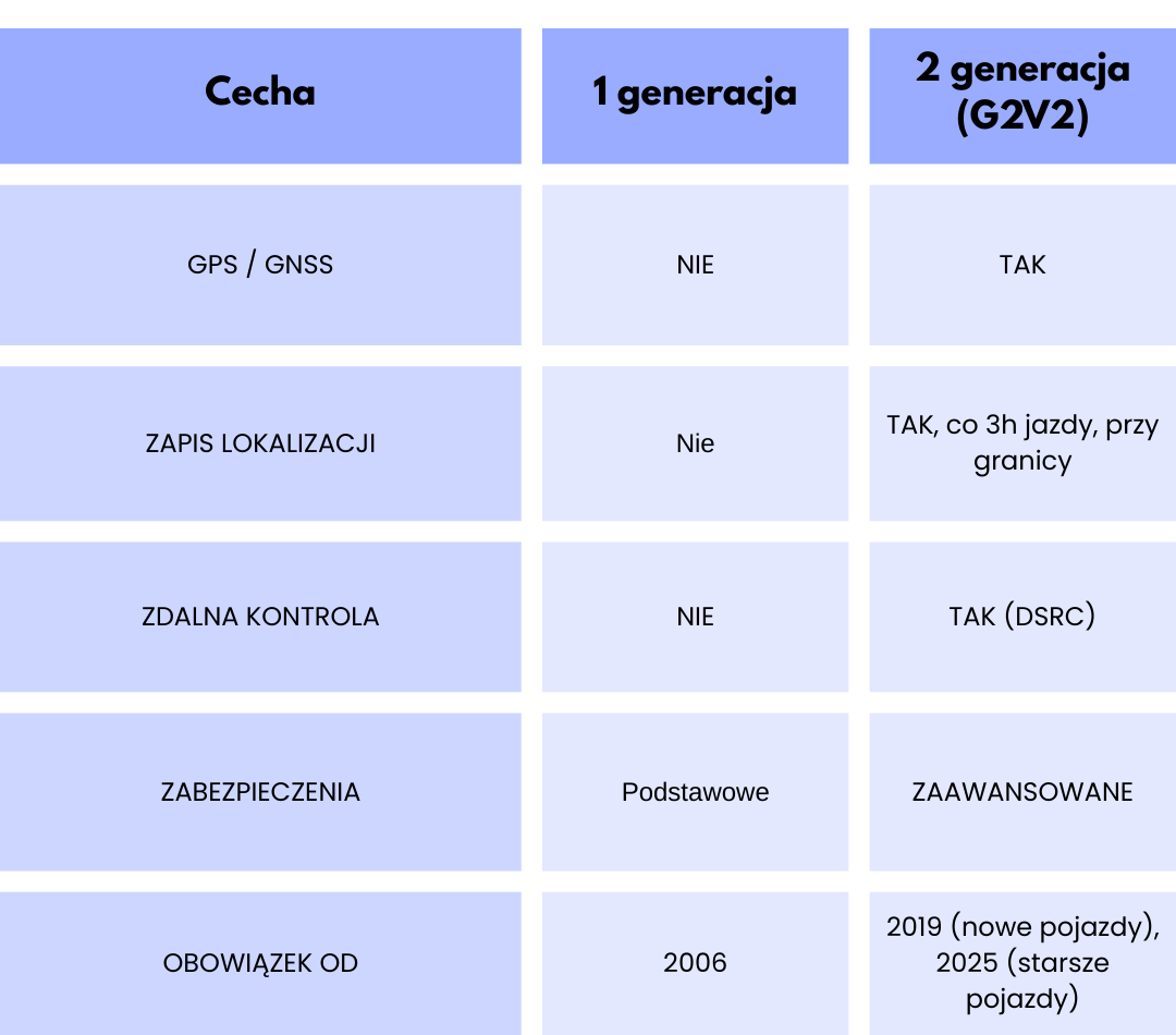 - Tachograf inteligentny 2. generacji (G2V2) – aktualny standard, z GPS-em, zdalnym monitoringiem i znacznie lepszą ochroną danych