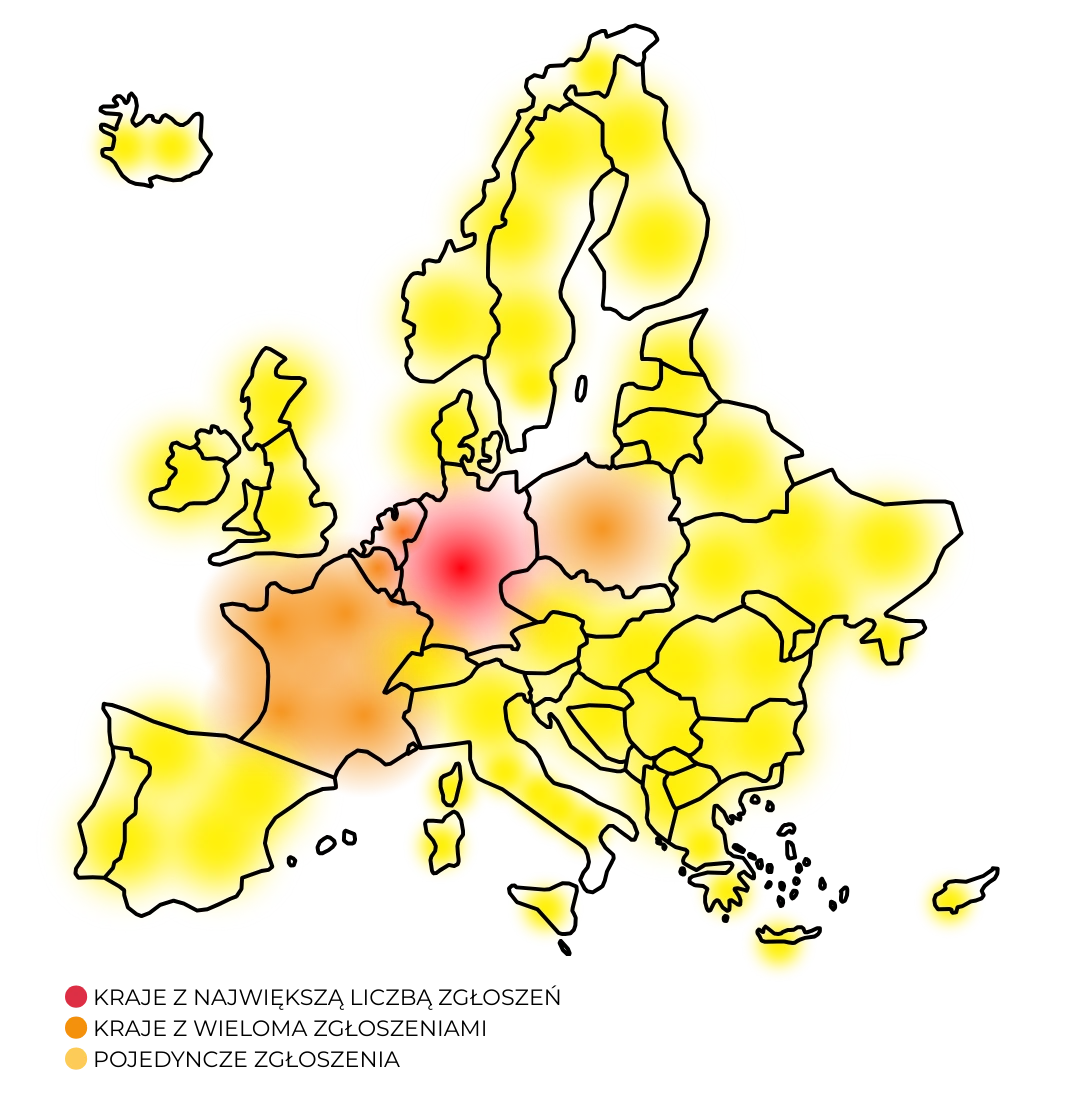 - Inne państwa europejskie – dziesiątki potwierdzonych zdarzeń