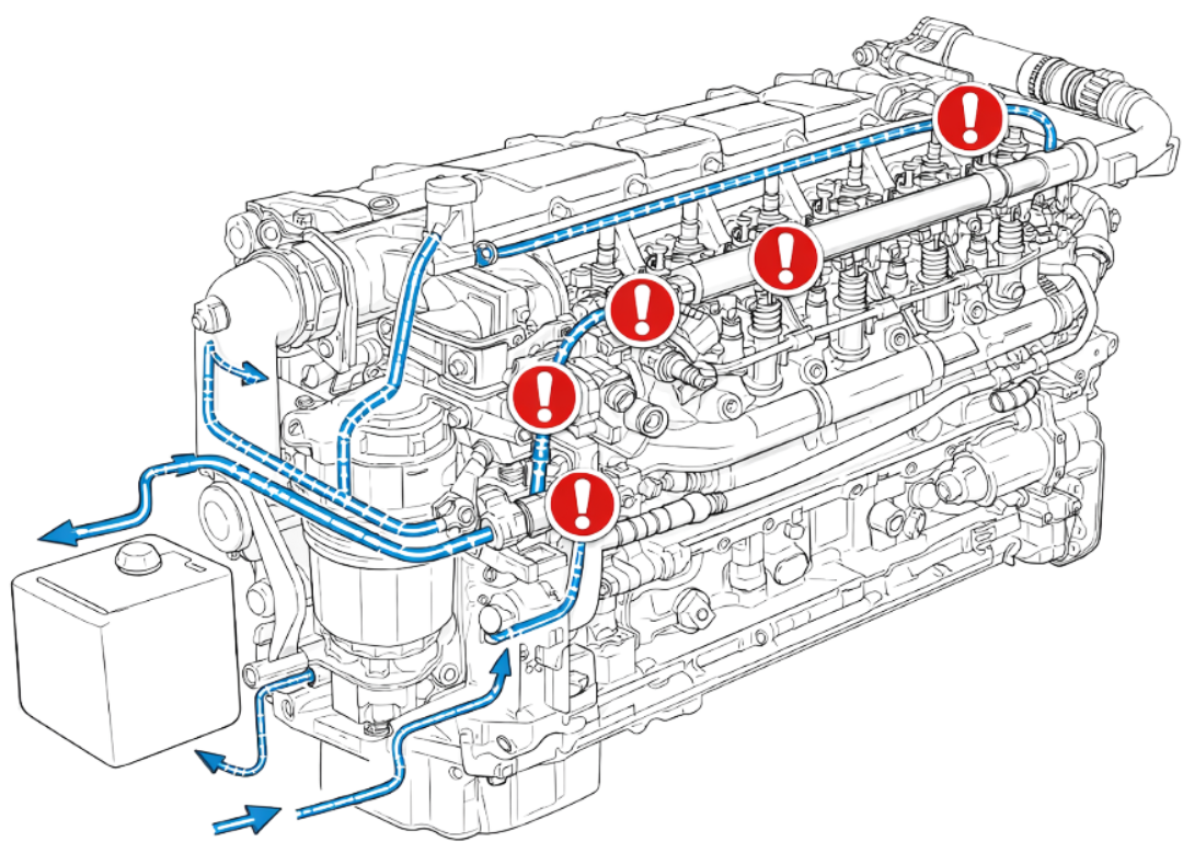 - Stan wszystkich przewodów paliwowych wysokiego ciśnienia (mikropęknięcia, oznaki wycieku, utlenianie)