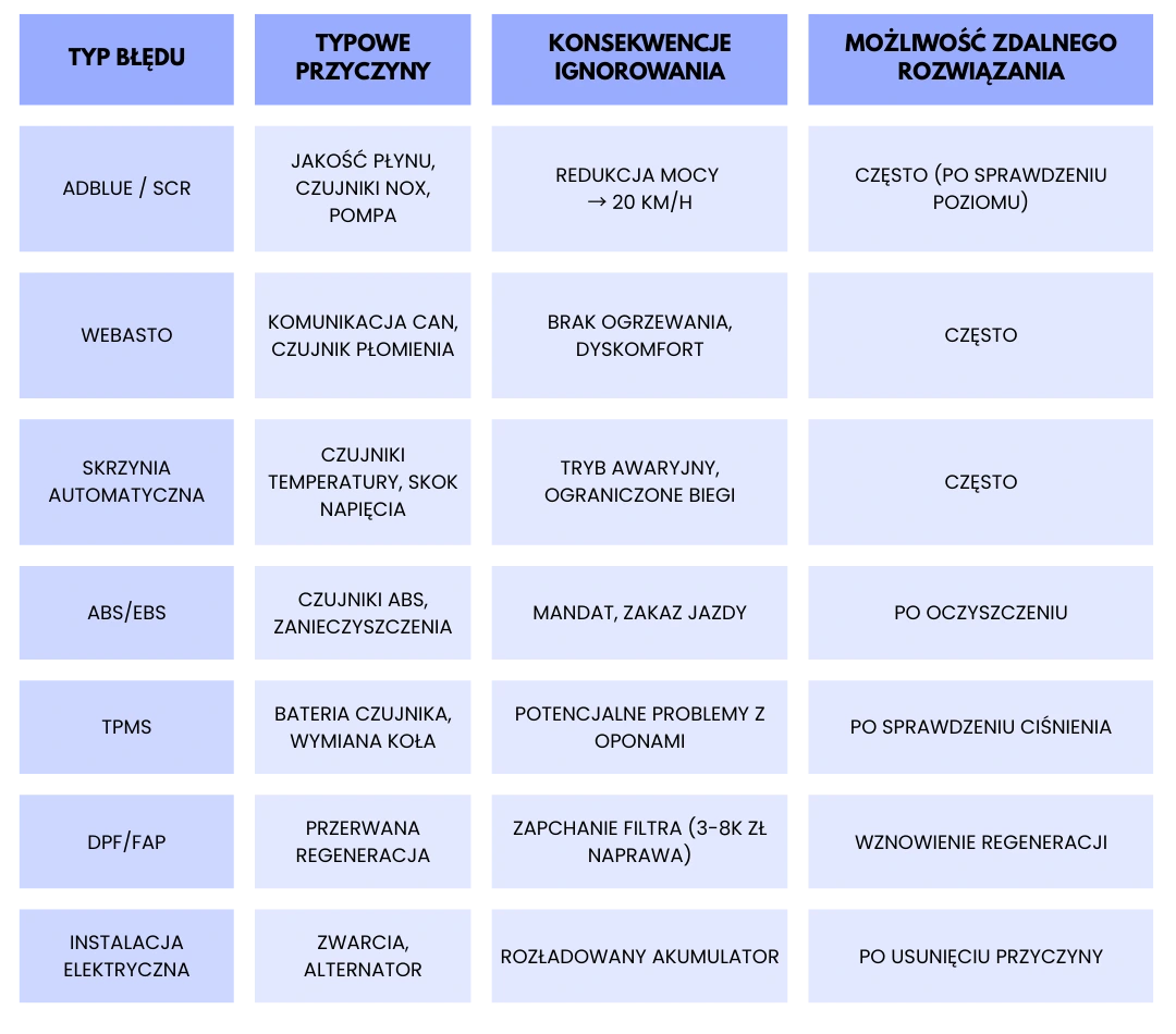 Najczęściej kasowane błędy to: błędy AdBlue (czujnik NOx, czujnik temperatury), błędy DPF (filtr cząstek stałych), błędy czujników (temperatura, ciśnienie), błędy Webasto oraz błędy komunikacji między sterownikami. Wyjątkiem są błędy wymagające fizycznej naprawy lub kalibracji (np. wymiana czujnika ABS).