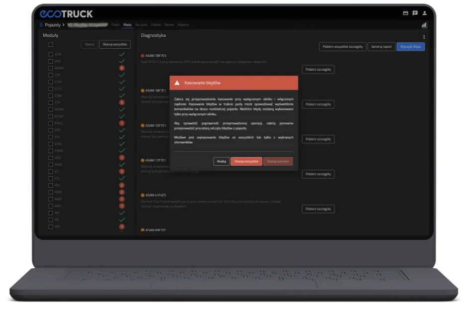 System ecoTRUCK pozwala na kasowanie błędów ze wszystkich dostępnych w pojeździe sterowników: silnika, skrzyni biegów, ABS/EBS, systemu AdBlue, klimatyzacji, Webasto, systemów bezpieczeństwa oraz wielu innych.