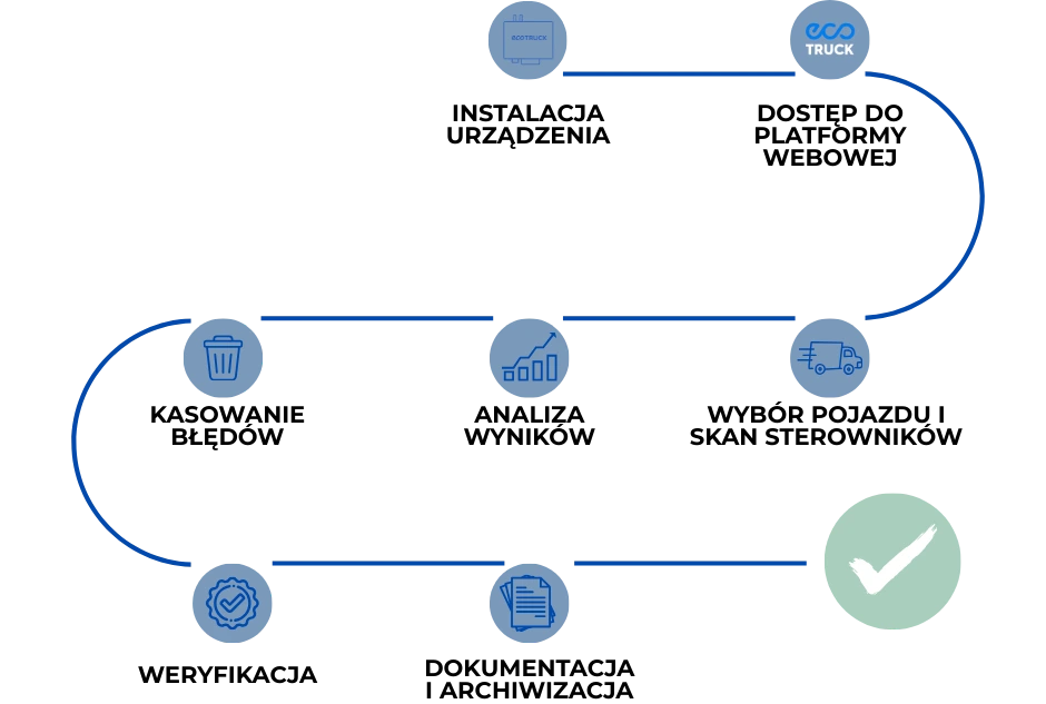 Wystarczy zalogować się do platformy, wybrać pojazd i konkretny sterownik (np. AdBlue), odczytać błędy i skasować je jednym kliknięciem. Cała operacja trwa kilkadziesiąt sekund i nie wymaga obecności mechanika ani zatrzymywania pojazdu.