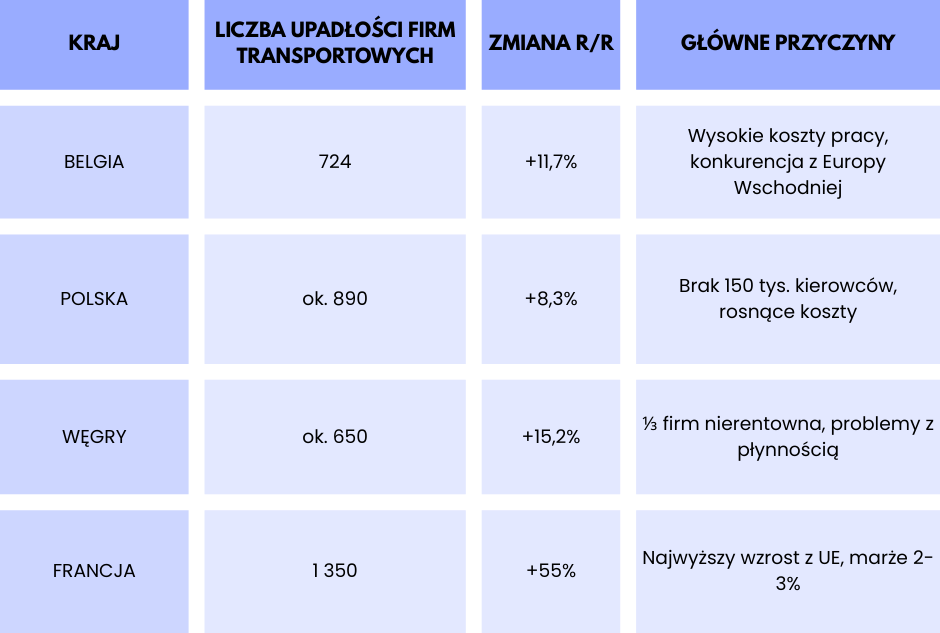 W 2024 roku Belgia ucierpiała w sektorze transportu. Aż 724 firmy zakończyły swoją działalność, jest to wzrost o 11,7% w porównaniu z rokiem poprzednim. Belgijskie firmy transportowe mierzą się z jednym z najwyższych kosztów pracy w Europie (minimalna stawka godzinowa to około 12 euro), podczas gdy ich główni konkurenci z Europy Wschodniej oferują usługi 30-40% taniej.