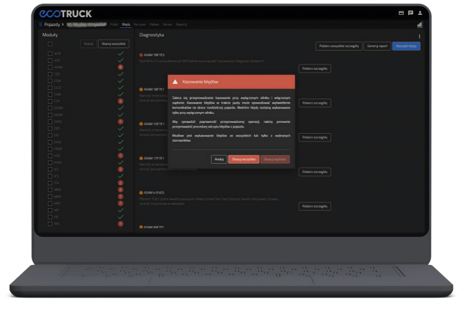 Zdalna diagnoza jak i kasowanie błędów redukuje nadmierne koszty serwisowe. Najczęściej przy redukcji mocy w trasie, gdzie błąd AdBlue uniemożliwia dalszą pracę bez wezwania pomocy.